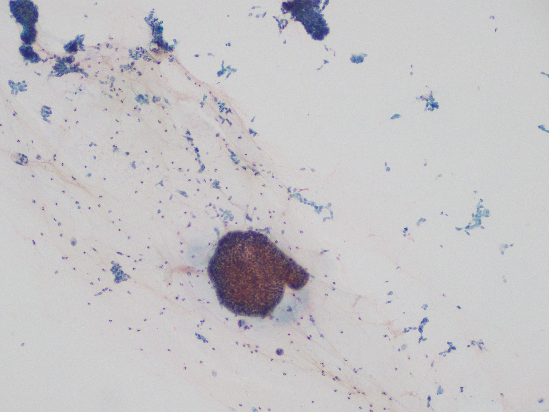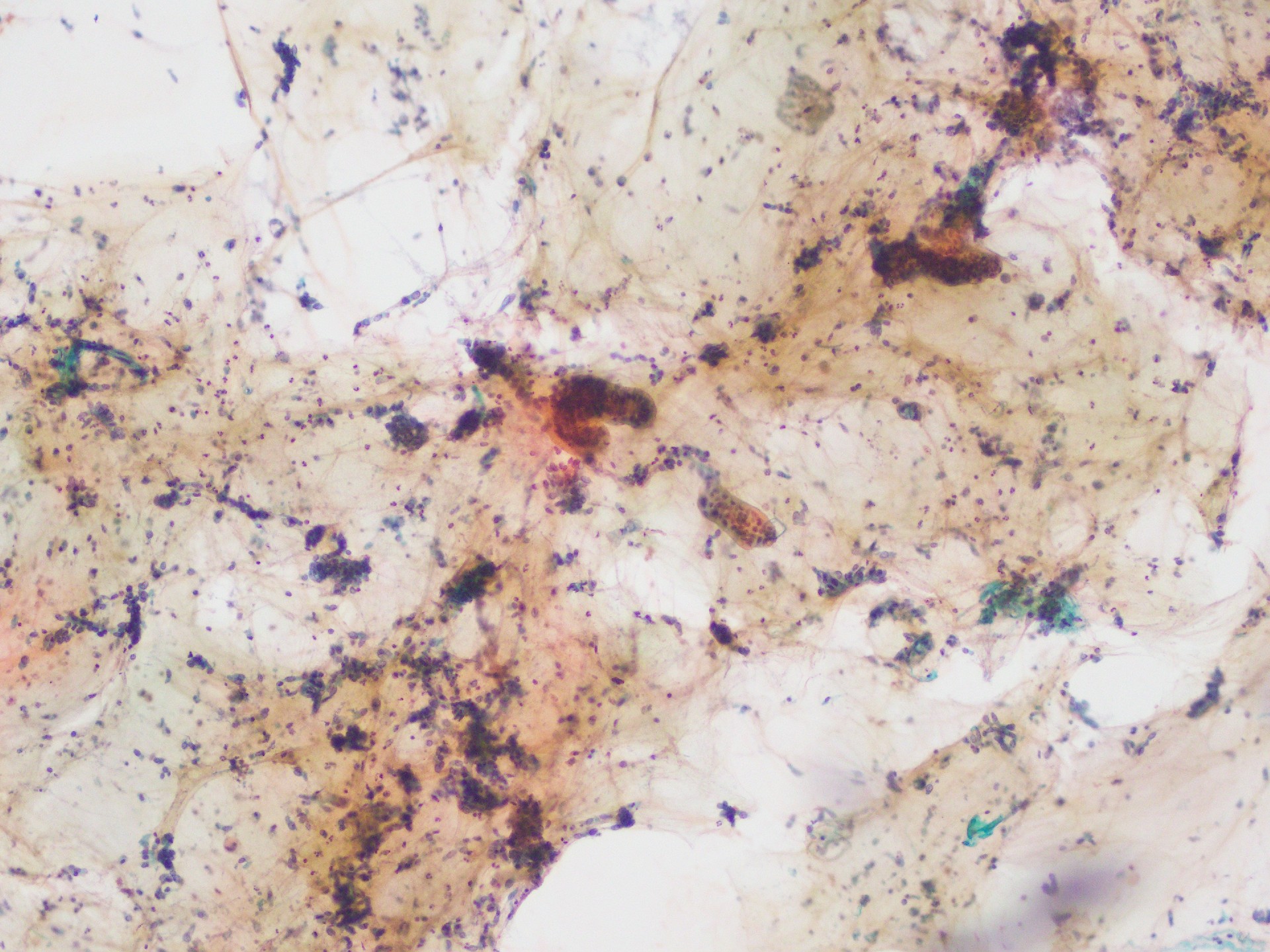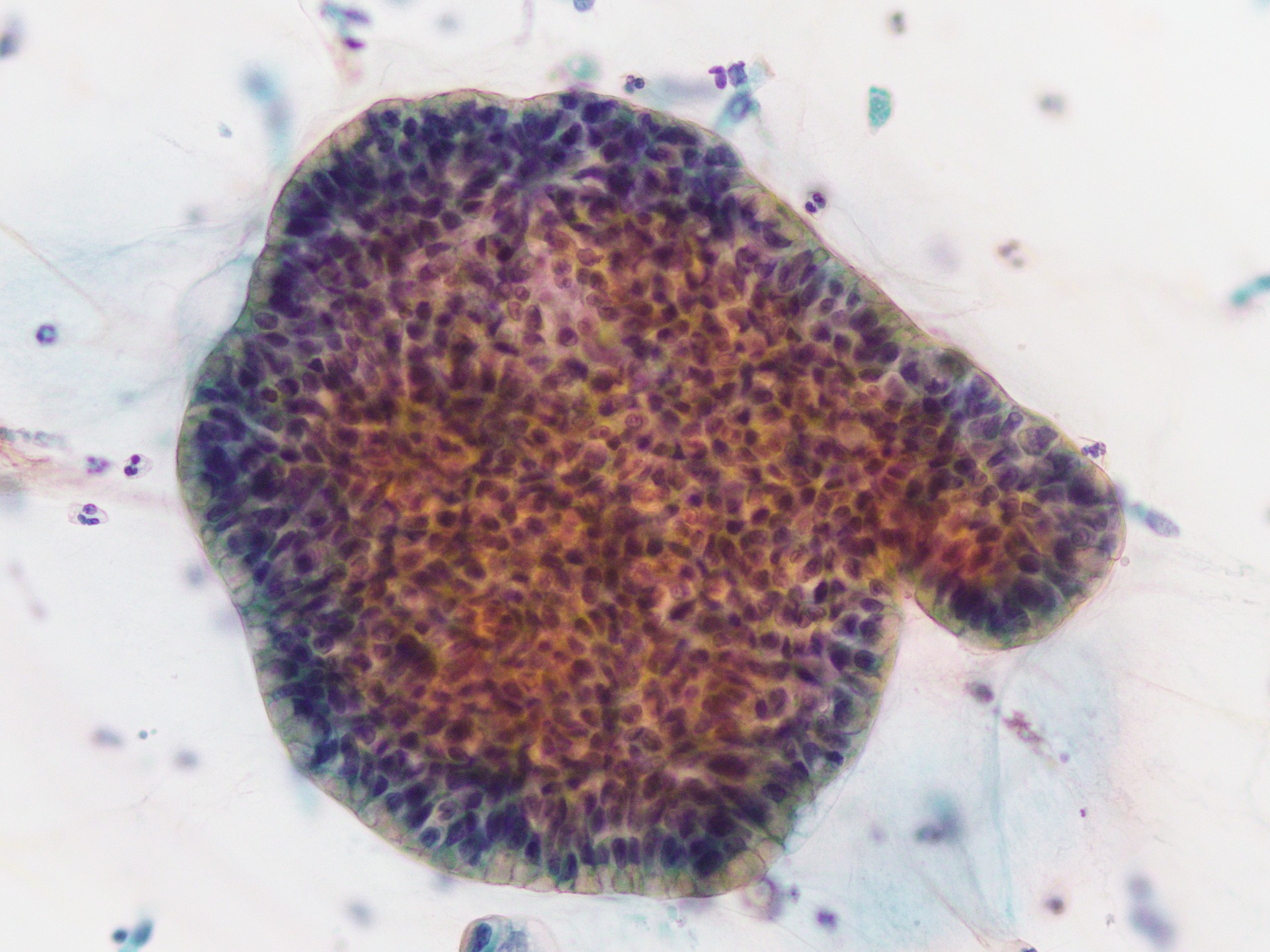 一般的に多量の粘液を背景に高円柱状で豊富な細胞質内粘液を有する細胞が、