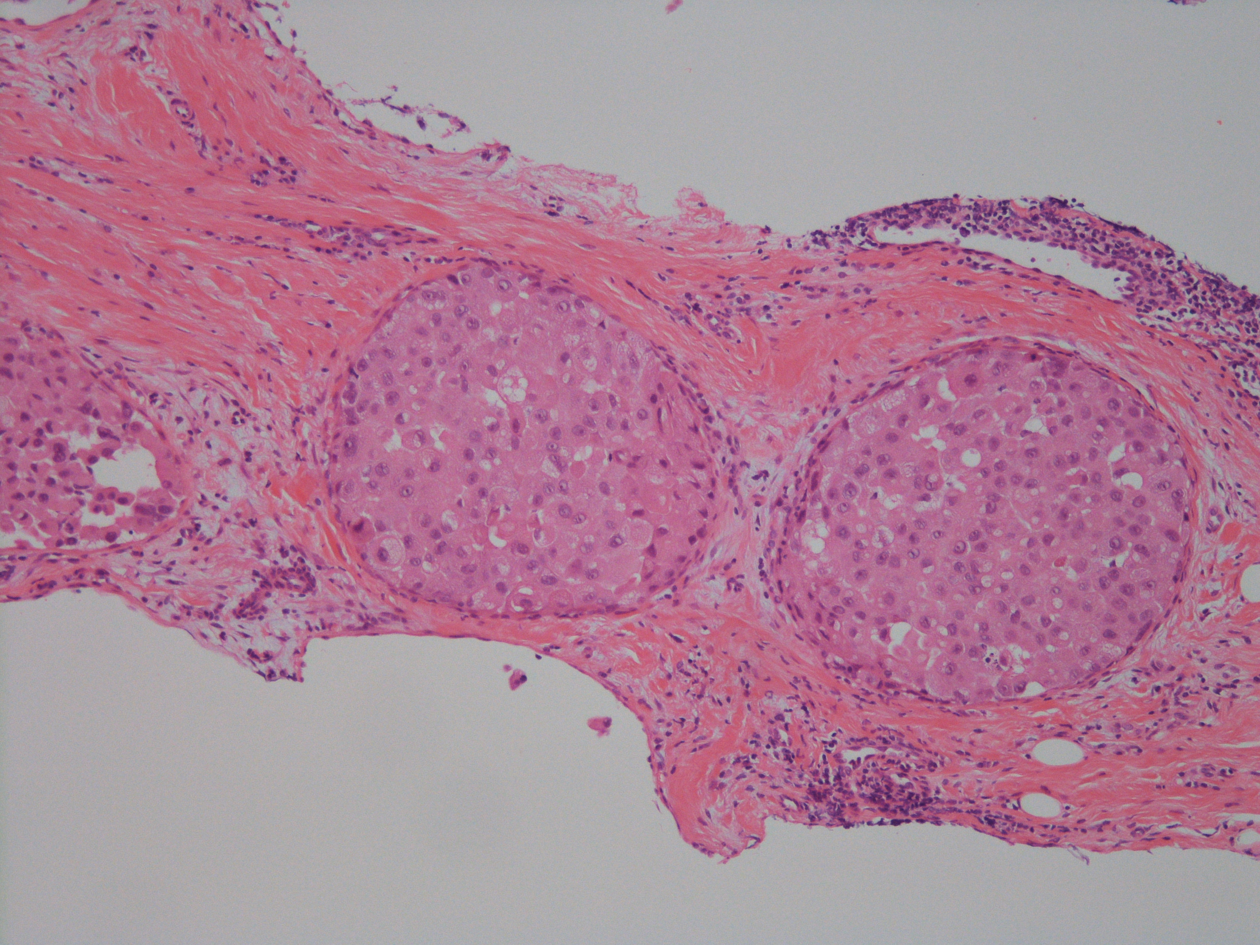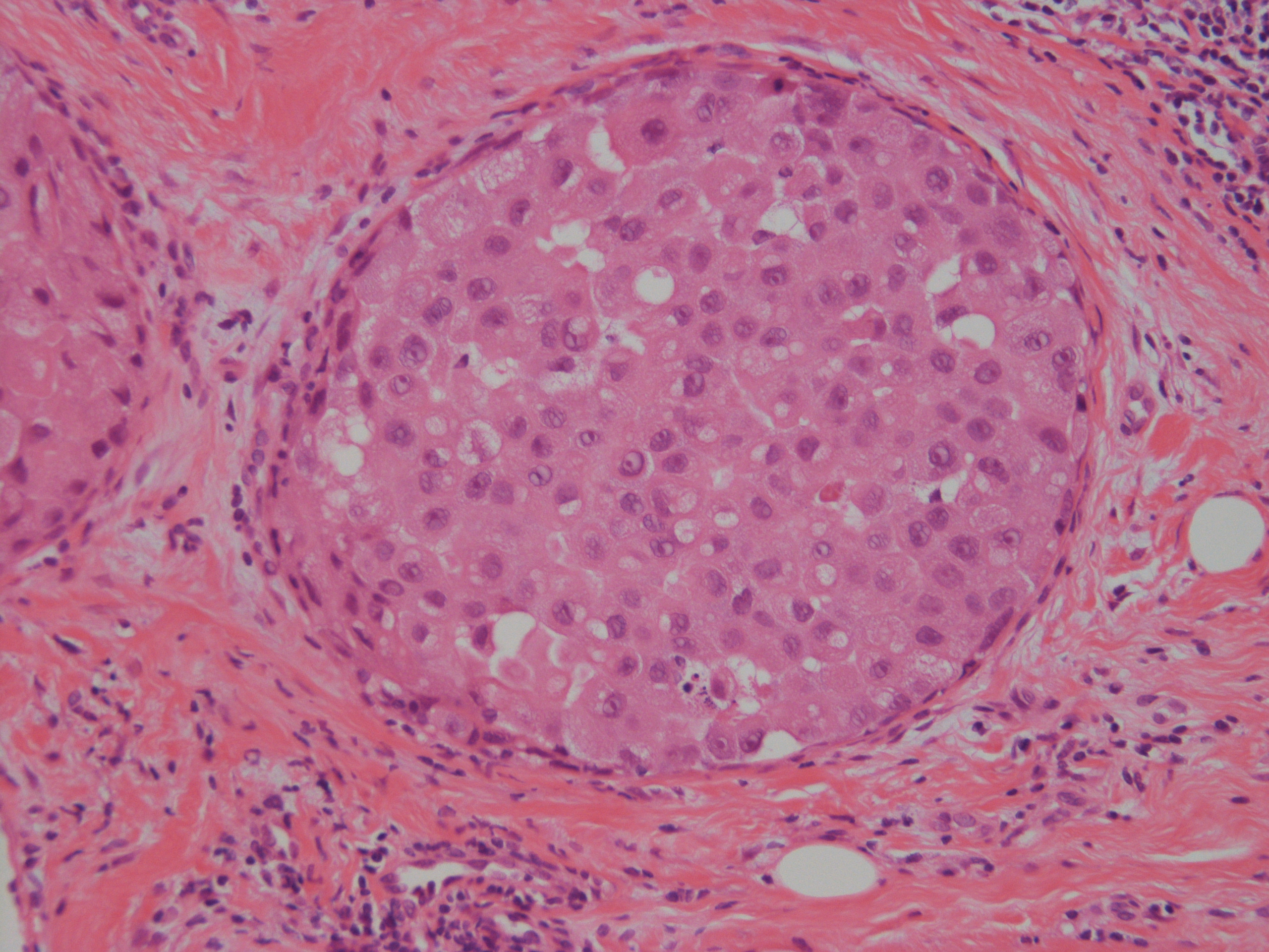 乳腺で厚く顆粒状の細胞質を有する異型細胞に遭遇した場合、上記の組織型が鑑別に上がりますが、
