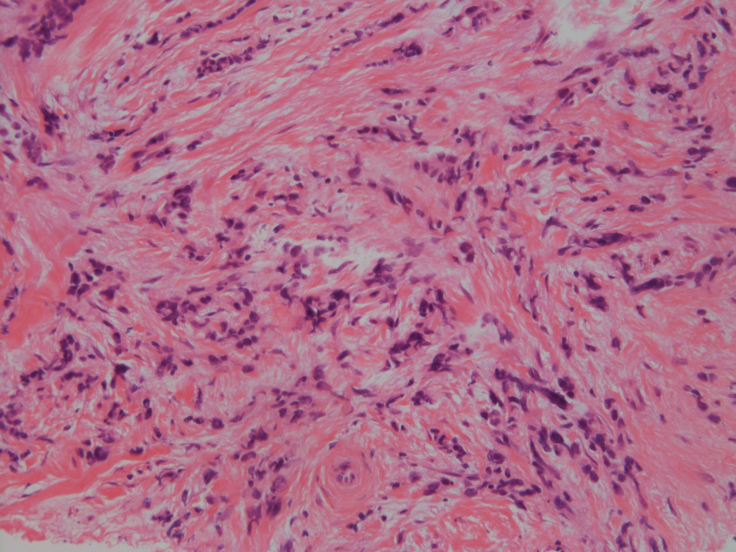 組織では免疫染色も含め総合的に浸潤部は小葉癌(ER+、 HER2-)であったが、