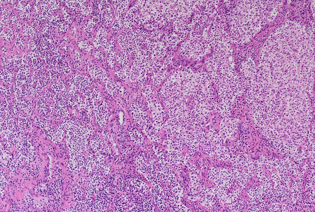 細胞像は裸核状で大小不同がみられるが、核形不整には乏しい細胞が多くみられる。