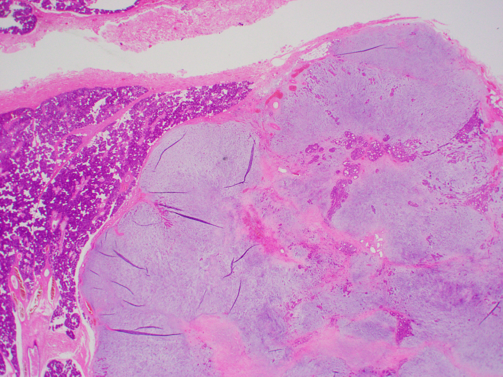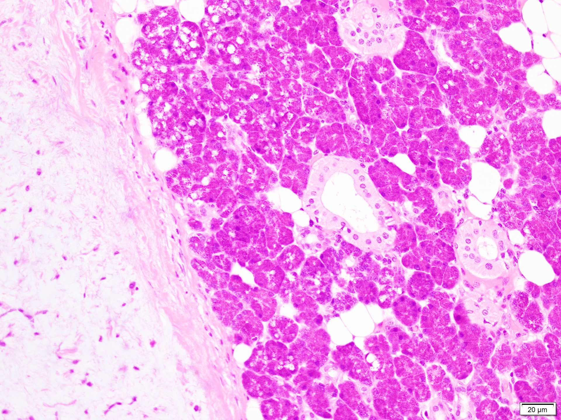 腫瘍辺縁には圧排され菲薄化した唾液腺被膜・小葉間結合織を認める。悪性を疑う像は明らかではない。
