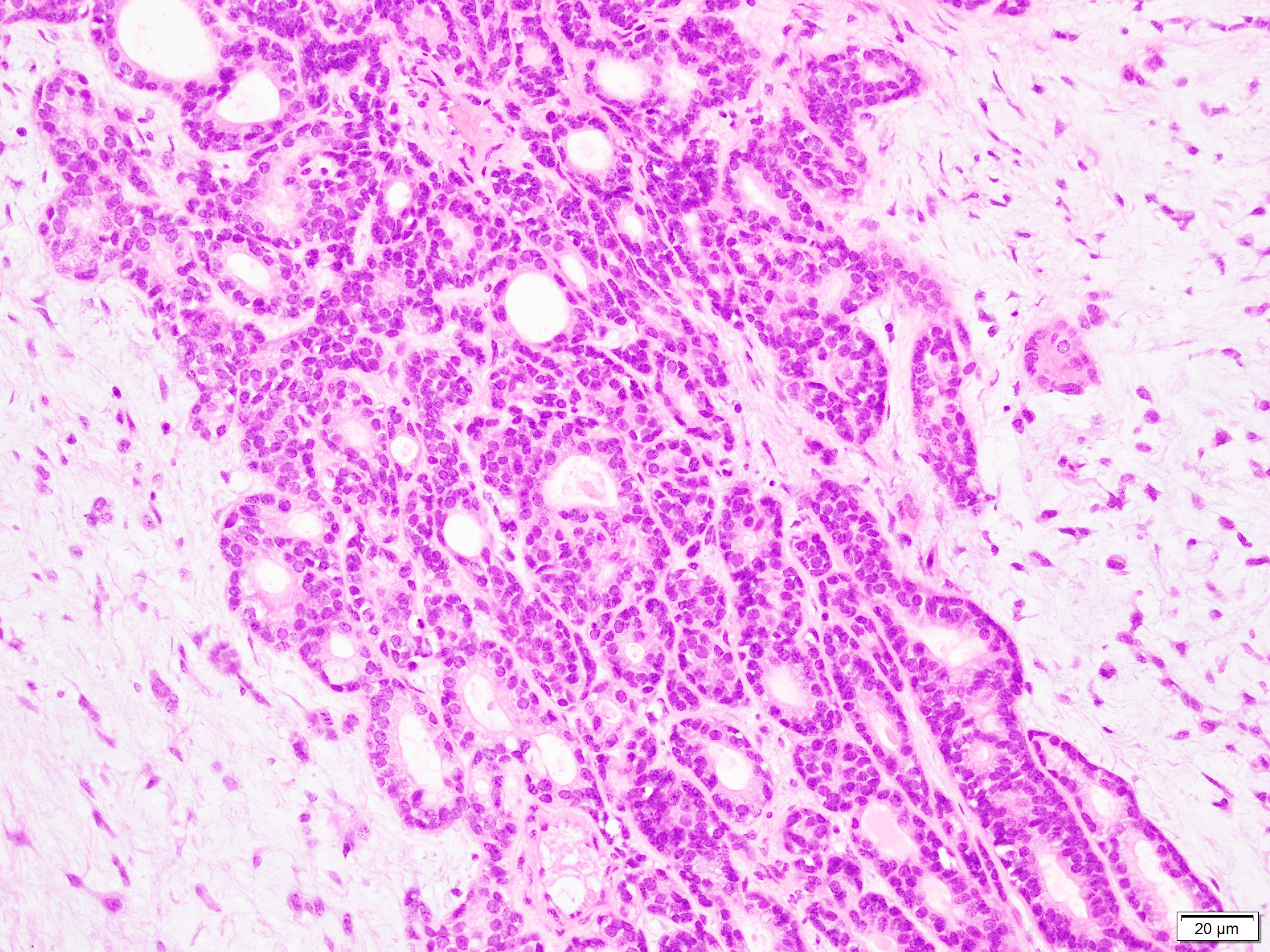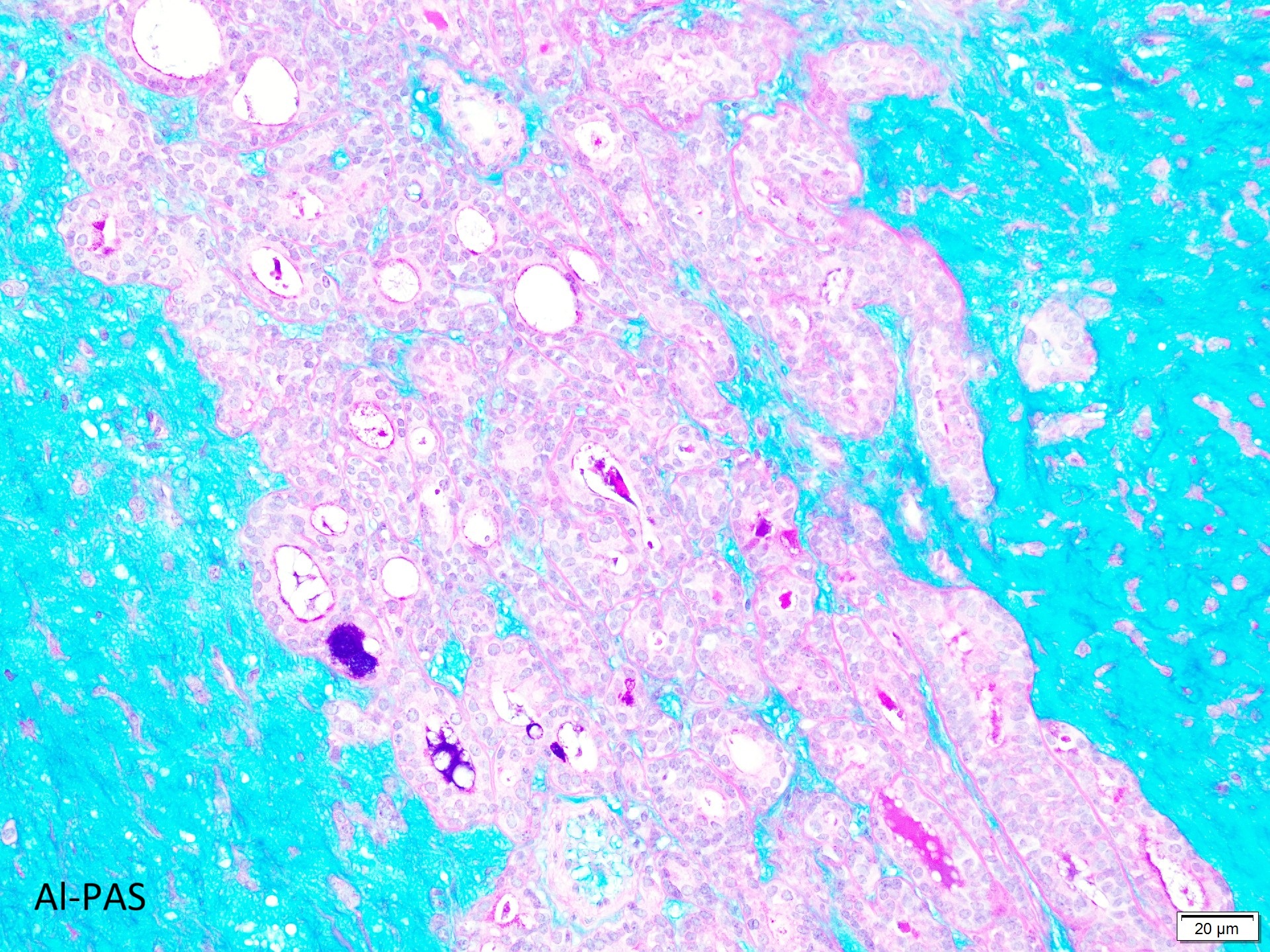 組織標本では、豊富な粘液腫状基質に、星芒状・短紡錘形の筋上皮細胞成分と、管状を示す腺管上皮成分を認める。