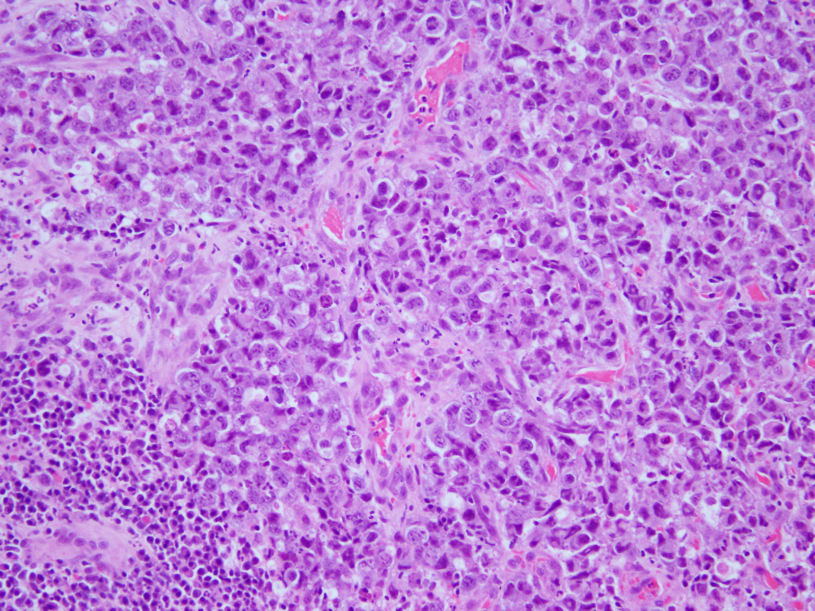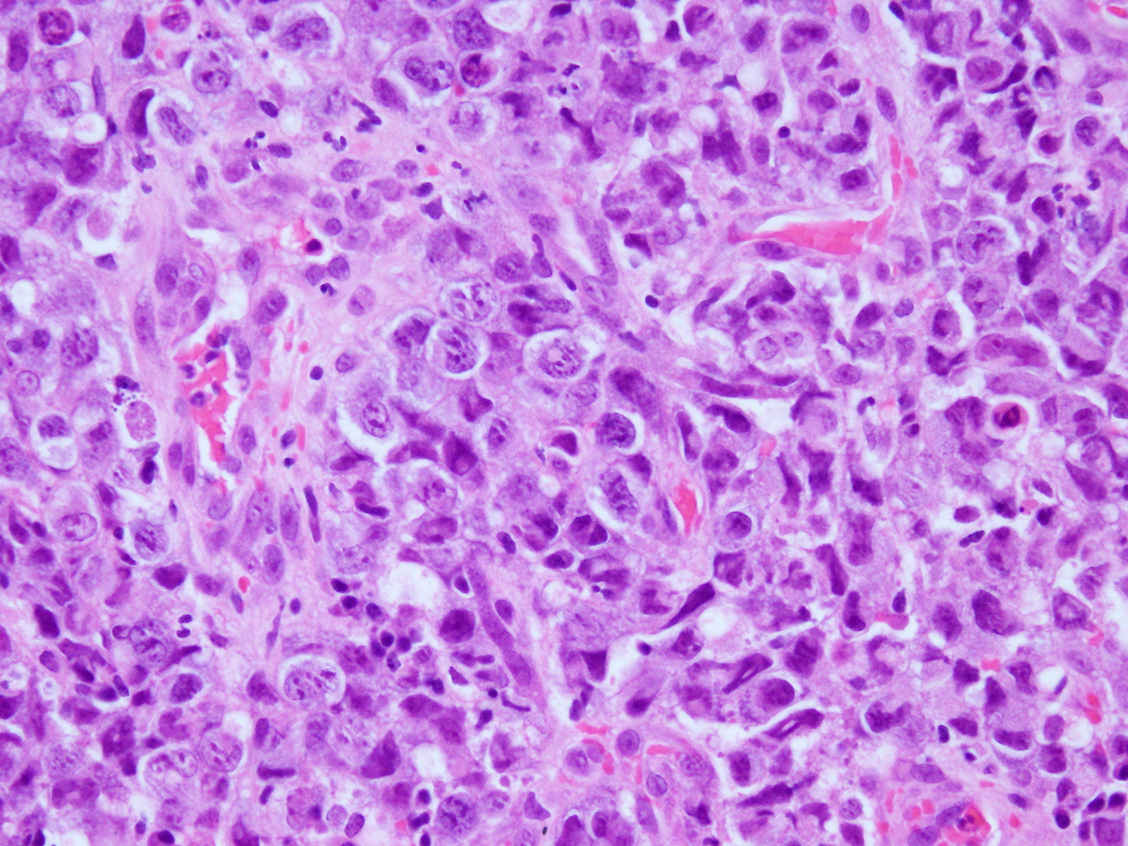 未分化大細胞型リンパ腫は大型の細胞がみられ、核異型が強く、結合性を示すものもある。そのため、ホジキンリンパ腫や癌との鑑別を要する。